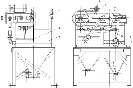 7-跳汰室;8-隔膜室; 9-跳汰室; 10-機(jī)架; 11-排礦活栓